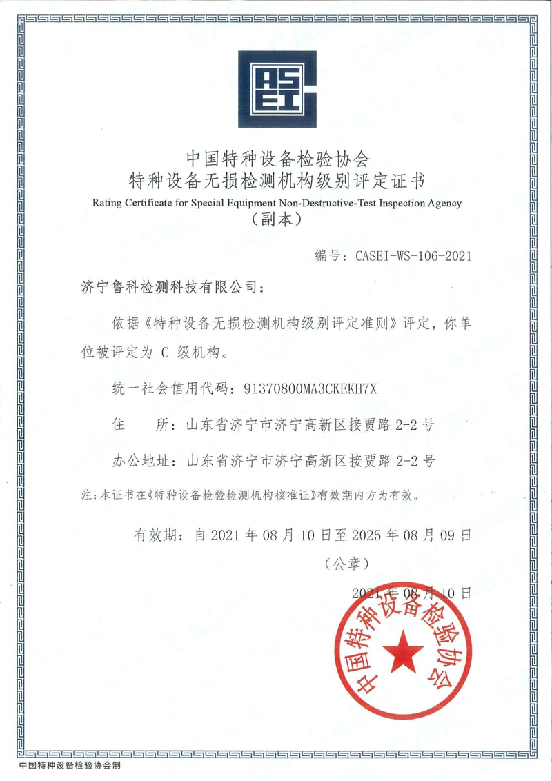 2016年注冊(cè)濟(jì)寧魯科檢測(cè)科技有限公司,專(zhuān)注于行業(yè)的第三方檢測(cè)始終堅(jiān)持“科學(xué)、公正、誠(chéng)信、高效”的質(zhì)量方針,并獲批中國(guó)特種設(shè)備檢驗(yàn)協(xié)會(huì)特種設(shè)備無(wú)損檢測(cè)機(jī)構(gòu)C級(jí)核準(zhǔn)單位