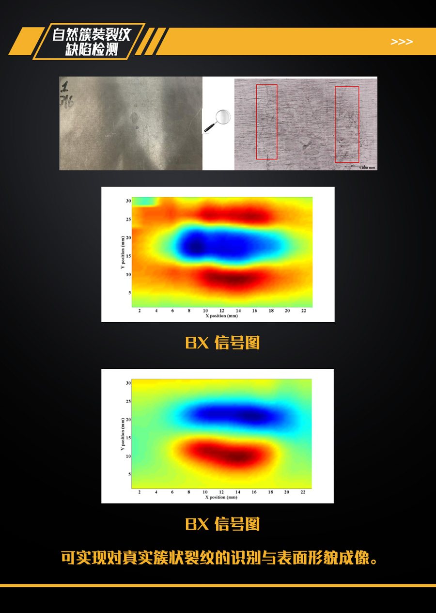 當(dāng)工件完好時(shí)各磁場(chǎng)分量為零,若有裂縫存在,工件表面磁場(chǎng)便會(huì)產(chǎn)生變異,儀器探頭迅 即將檢出的訊號(hào)輸入計(jì)算機(jī)分析,經(jīng)軟件運(yùn)算后可實(shí)時(shí)地將裂縫之正確位置長(zhǎng)度及深度顯示出來。