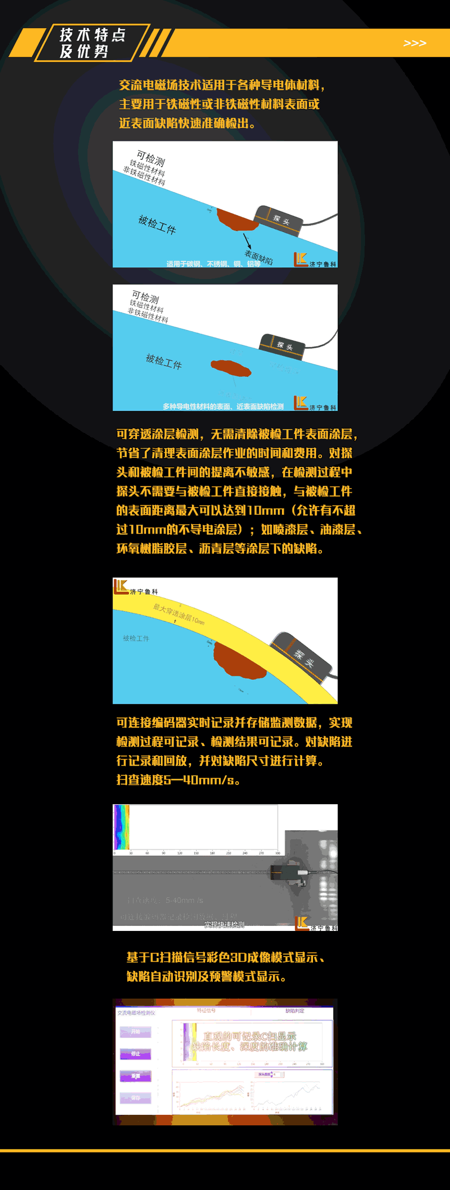 1、交流電磁場(chǎng)檢測(cè)技術(shù)適用各種導(dǎo)電體材料,主要用于鐵磁性或非鐵磁性材料對(duì)于表面或近表面的缺陷可以快速準(zhǔn)確的檢出;