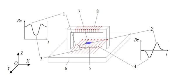 1-電流在裂紋兩端聚集時,Bx出現(xiàn)凸起;2-電流在裂紋尖端順時針旋轉(zhuǎn)時,Bz出現(xiàn)波峰;3-電流從裂紋底部終過時,Bx出現(xiàn)波谷;4-電流在裂紋尖端逆時針旋轉(zhuǎn)時,Bz出現(xiàn)波谷;5-缺陷;6-待檢工件;7-傳感器;8-激勵線圈。