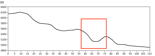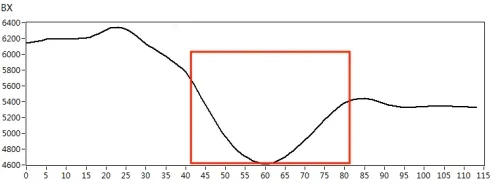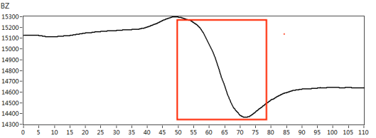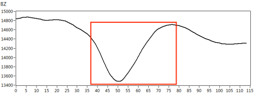 原始采集信號中雖然存在高頻噪聲和探頭抖動帶來的干擾,但經(jīng)過平滑濾波算法處理后,噪聲基本被完全消除,信號曲線變得平滑穩(wěn)定;并且存在裂紋的位置,Bx信號清晰呈現(xiàn)出波谷特征,Bz信號則出現(xiàn)了標(biāo)準(zhǔn)的正負(fù)交替波峰,與ACFM檢測原理完全吻合,缺陷檢測圖像如4、5所示。