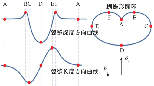 ACFM技術(shù)基于電磁感應(yīng)原理,其核心思想是在被測導(dǎo)體表面施加均勻的交流電流(通常頻率在1-10kHz),電流在遇到缺陷(如裂紋)時會發(fā)生畸變,從而在缺陷周圍產(chǎn)生可測量的磁場擾動,如圖1所示。磁場信號變化與特征點對應(yīng)如圖2所示。