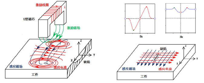 交流電磁場檢測(簡稱ACFM)技術(shù),其工作原理是激勵(lì)線圈在工件中感應(yīng)出均勻的交變電流,感應(yīng)電流在裂紋、腐蝕等缺陷位置產(chǎn)生擾動,基于電場擾動引起空間磁場畸變原理,利用檢測傳感器捕獲空間磁場畸變信號,從而實(shí)現(xiàn)缺陷的檢測與評估。