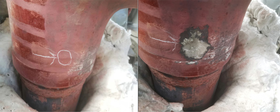 高溫蒸汽閥門應(yīng)用過(guò)程中存在異常,使用ACFM技術(shù)進(jìn)行在役檢測(cè),通過(guò)限流方式控制閥門溫度低于350℃,進(jìn)行檢測(cè)。檢測(cè)過(guò)程發(fā)現(xiàn)多處缺陷,以表面裂紋與內(nèi)部孔砂孔為主,檢測(cè)結(jié)果經(jīng)過(guò)打磨得以驗(yàn)證,如圖5、6所示。