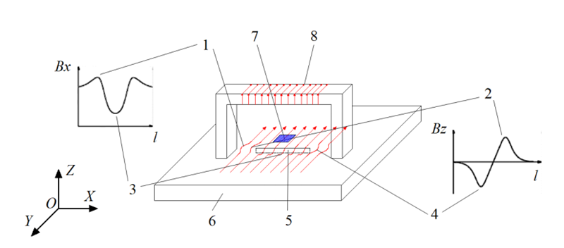 1-電流在裂紋兩端聚集時,Bx出現(xiàn)凸起;2-電流在裂紋尖端順時針旋轉(zhuǎn)時,Bz出現(xiàn)波峰;3-電流從裂紋底部終過時,Bx出現(xiàn)波谷;4-電流在裂紋尖端逆時針旋轉(zhuǎn)時,Bz出現(xiàn)波谷;5-缺陷;6-待檢工件;7-傳感器;8-激勵線圈。