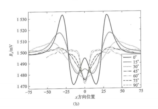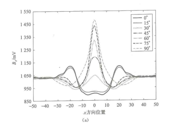 如圖5-8所示,當檢測試件為鋼材料時,掃查方向與裂縫方向的夾角從0°增加到90°時,Bx信號最大值的整體趨勢為逐漸增大。然而,當檢測試件為鋁材料時,Bx隨著夾角的增大,所有的信號都是減小的