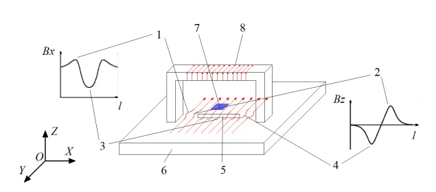 1-電流在裂紋兩端聚集時,Bx出現(xiàn)凸起;2-電流在裂紋尖端順時針旋轉(zhuǎn)時,Bz出現(xiàn)波峰;3-電流從裂紋底部穿過時,Bx出現(xiàn)波谷;4-電流在裂紋尖端逆時針旋轉(zhuǎn)時,Bz出現(xiàn)波谷;5-缺陷;6-待檢工件;7-傳感器;8-激勵線圈。