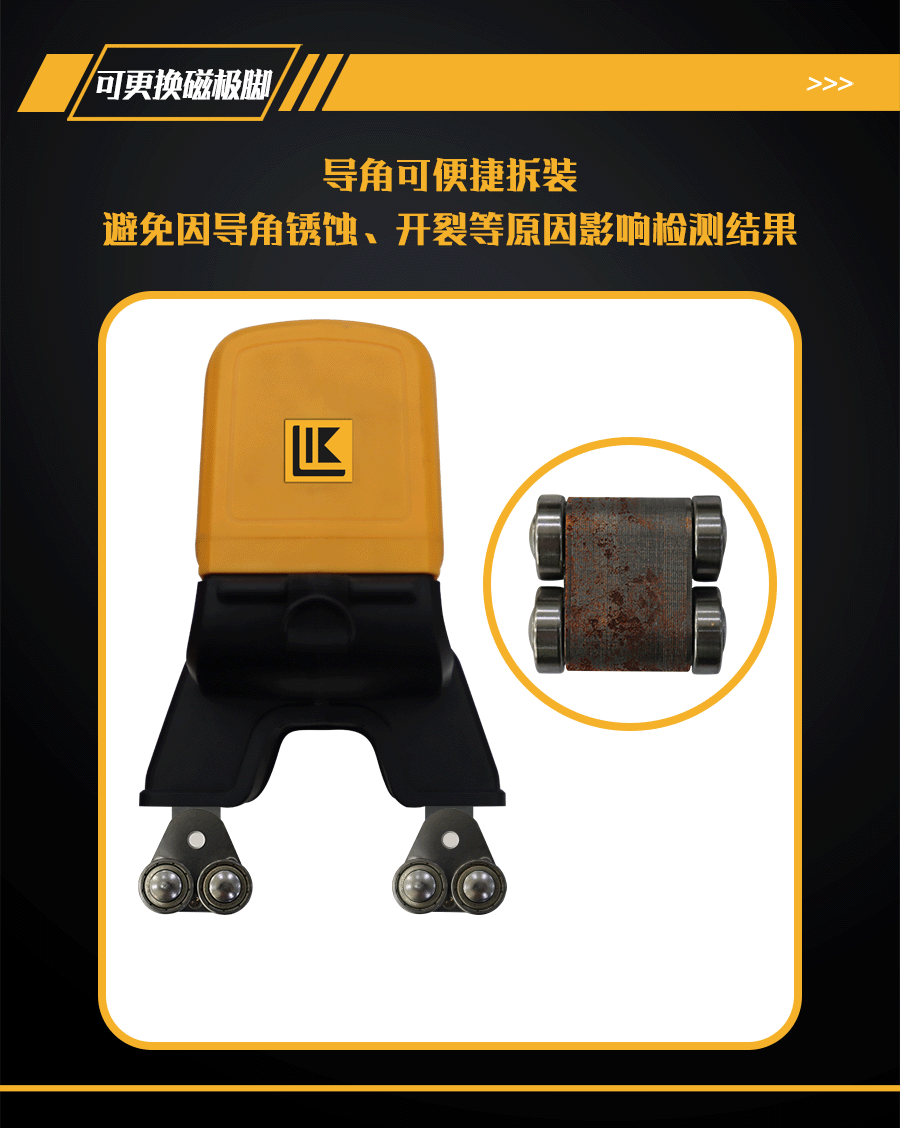 7、每個(gè)磁極腳安裝4只軸承,步進(jìn)探傷無阻力;每個(gè)磁極腳可自行便捷拆裝、更換;
