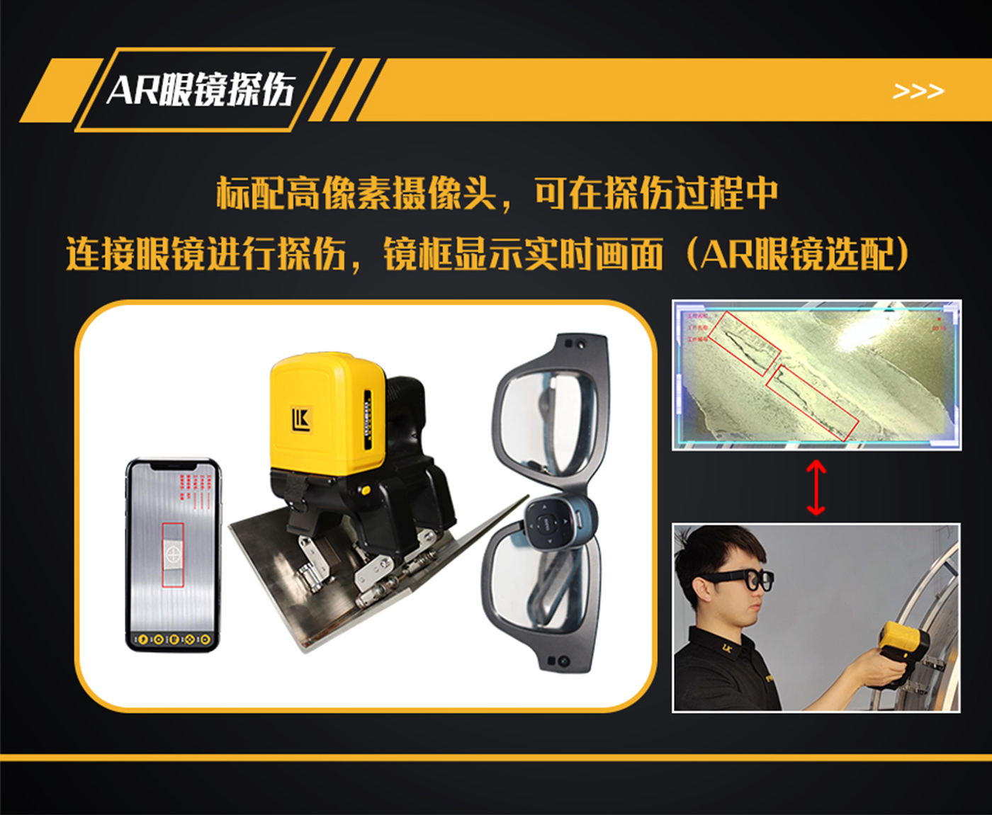 11、探頭內(nèi)部裝有500萬(wàn)像素?cái)z像頭,手機(jī)、平板電腦或AR眼鏡等手持終端安裝APP軟件,通過(guò)Wi-Fi與探頭鏈接,手持終端實(shí)時(shí)顯示探傷狀態(tài);