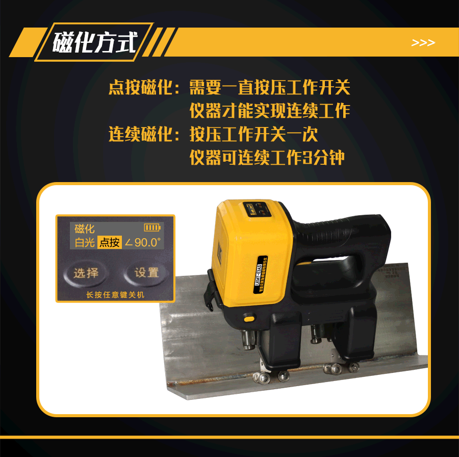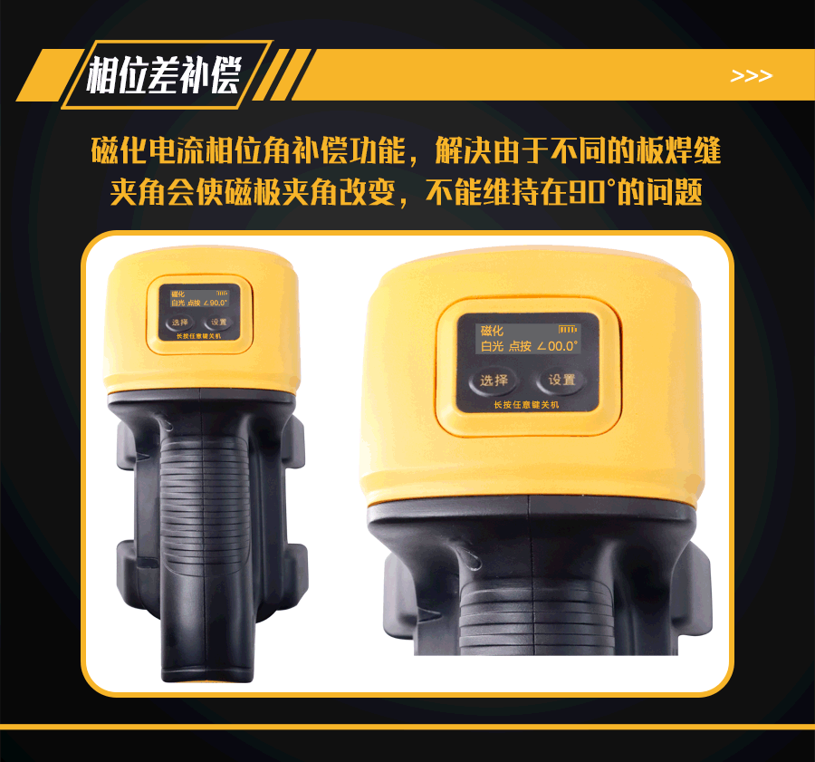 10、磁化電流相位角補(bǔ)償功能;檢測(cè)不同夾角度的角焊縫,可在鋰電池電源OLED顯示屏上設(shè)置需要探測(cè)的工件夾角,解決由于不同的板焊縫夾角會(huì)使磁極夾角改變,不能維持在90°的問(wèn)題;
